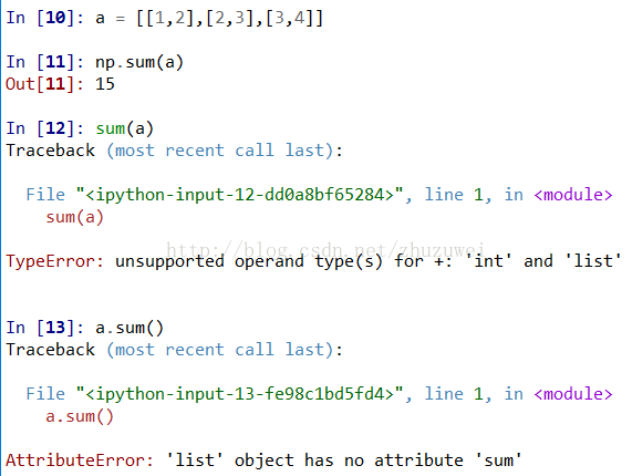 1. 列表使用sum, 如下代码,对1维列表和二维列表,numpy.sum(a)都能将列表a中的所有元素求和并返回,a.sum()用法是非法的。