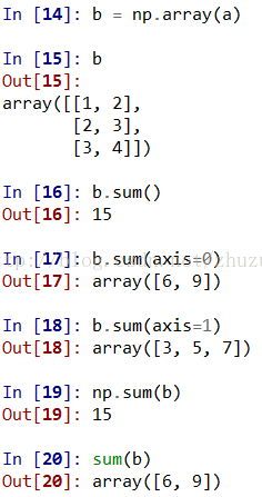 但是对于二维数组b,代码b.sum(axis=0)指定对数组b对每列求和,b.sum(axis=1)是对每行求和,返回的都是一维数组(维度降了一维)。