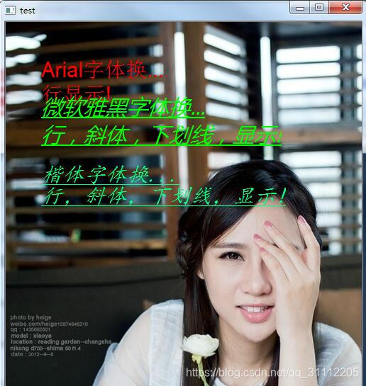 putTextZH(img, "微软雅黑字体换...\n行,斜体,下划线,显示!", Point(50, 100), Scalar(0, 255, 0), 30, "微软雅黑", true, true);