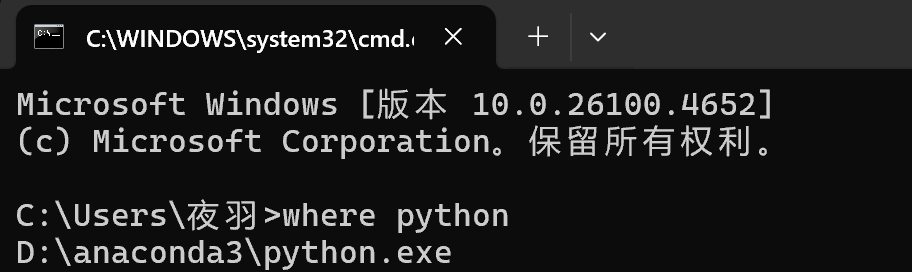 Win + R组合键,输入cmd并回车,打开命令提示符窗口。在其中输入where python后回车,系统会列出所有在环境变量中配置的 Python 解释器路径。 -