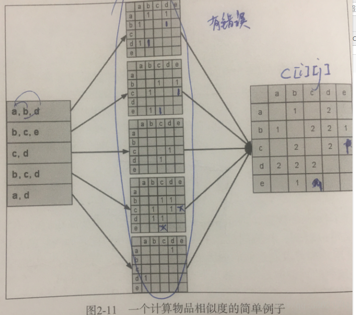 该算法的图形解释如下,图中最左边是输入的用户行为记录,每一行代表一个用户感兴趣的物品集合。然后,对于每个物品集合,我们将里面的物品两两加 1 ,得到一个矩阵。最后将这些矩阵相加得到 C 矩阵。其中 C[i][j] 记录了同时喜欢物品i 和物品 j 的用户数。最后将C 矩阵归一化可以得到物品之间的余弦相似度矩阵 W 。