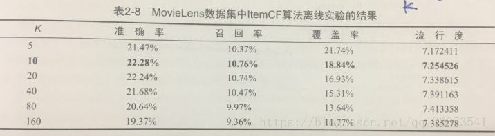 准确率和召回率:可以看出 ItemCF 推荐结果的精度也是不跟 K 值成正负相关的。