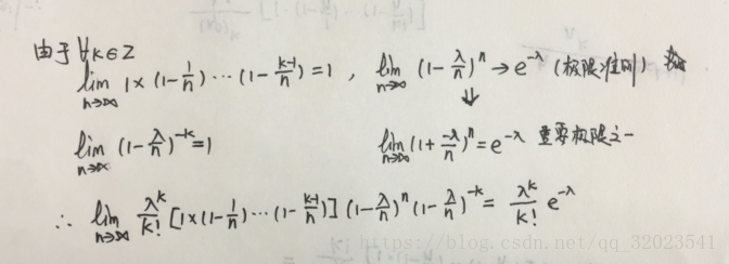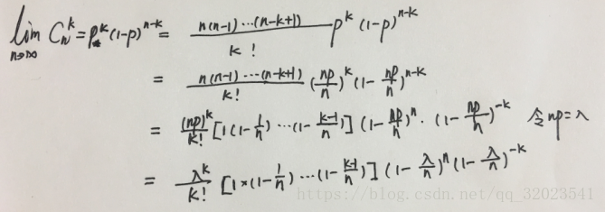 现在我们设想一个特殊的情况,假设事件每次发生的概率 p 很小,并且重复实验的次数 n 比较大,那么当这种情况的二项分布时,有(不好写公式,用草稿代替)