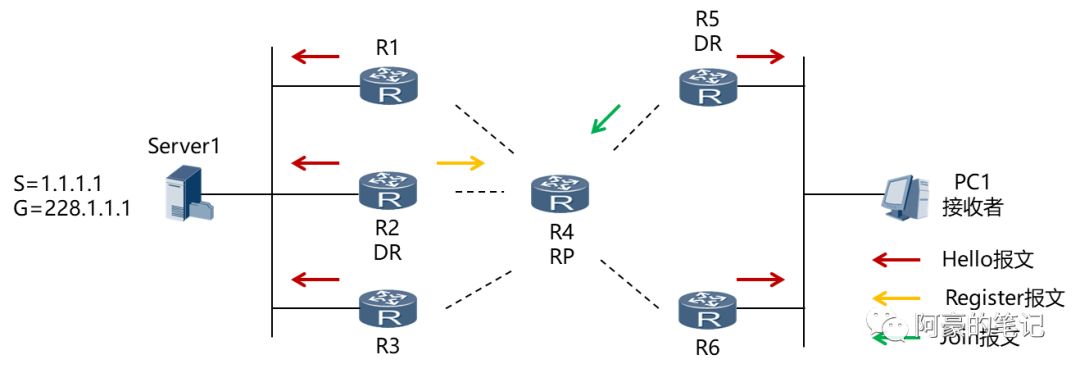 在连接组成员的共享网段,由DR负责向RP发送Join加入报文。与组成员相连的DR称为组成员端DR,此DR可充当IGMPv1环境下的IGMP查询器。
