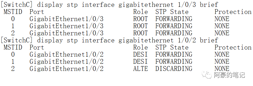 # 在SwitchC上执行display stp interface brief命令,结果如下: