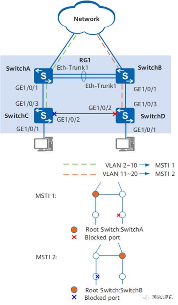 一个MST域内可以生成多棵生成树,每棵生成树都称为一个MSTI,每个MSTI都使用单独的RSTP算法,计算单独的生成树。