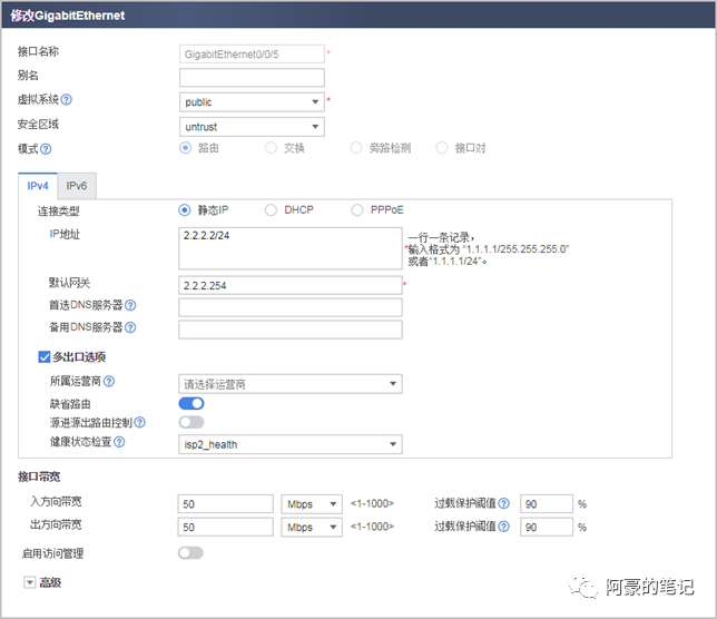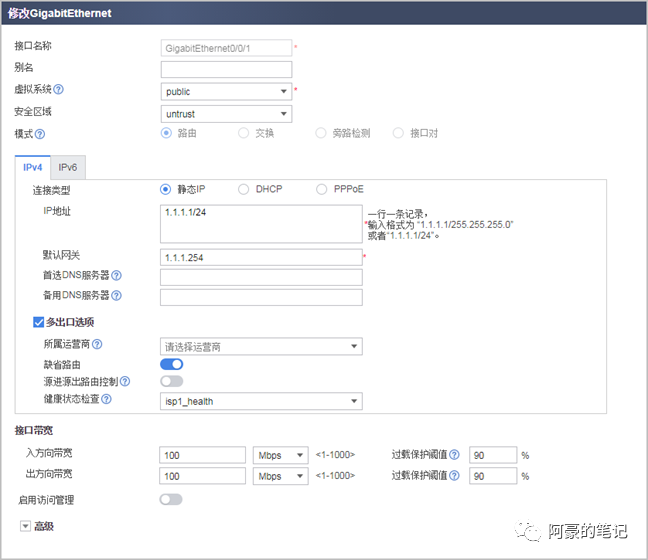 配置接口的IP地址、安全区域、网关地址、带宽和过载保护阈值,并在接口上应用健康检查。