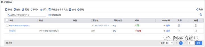 此外,系统默认存在一条缺省DNS透明代理策略default,default位于策略列表的最底部,优先级最低,所有匹配条件均为any,动作为不代理。如果所有配置的策略都未匹配,则将匹配缺省DNS透明代理策略。