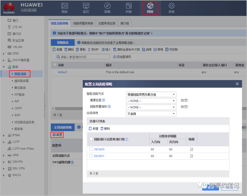 5.配置全局选路策略,流量根据链路带宽负载分担。并将GigabitEthernet 0/0/1和GigabitEthernet 0/0/5加入出接口列表。