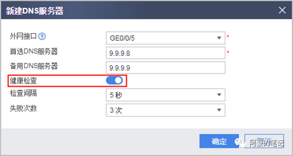 通过在DNS透明代理中配置健康检查,可以判断出接口上绑定的DNS服务器是否可用,如果首选DNS服务器和备用DNS服务器都不可用,则DNS透明代理不生效。