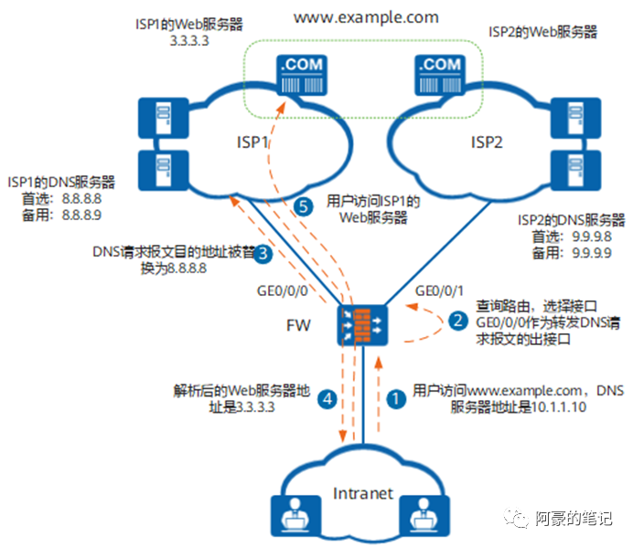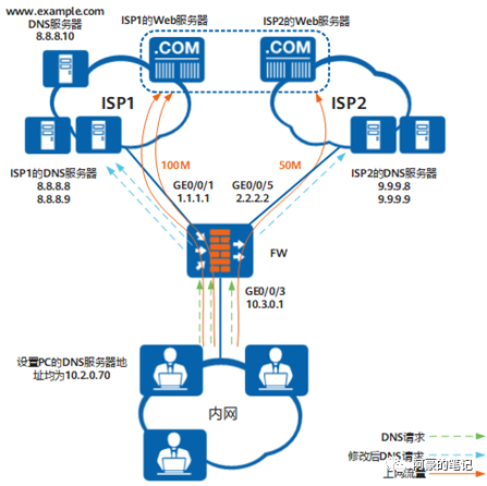 当内网用户通过域名访问Web服务器时,可以使用该场景。通过配置DNS透明代理,可以使DNS请求报文根据选择的出接口,修改DNS请求报文的目的地址(DNS服务器地址)。通过配置ISP选路和全局选路策略,FW根据报文目的地址所属ISP网络选择相应的出接口,并根据全局选路策略,实现链路资源的合理利用。 |