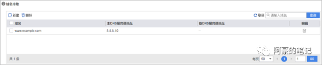 配置内网用户访问域名www.example.com时,不做DNS透明代理,但是要在指定的DNS服务器(8.8.8.10)上解析该域名对应的Web服务器地址。