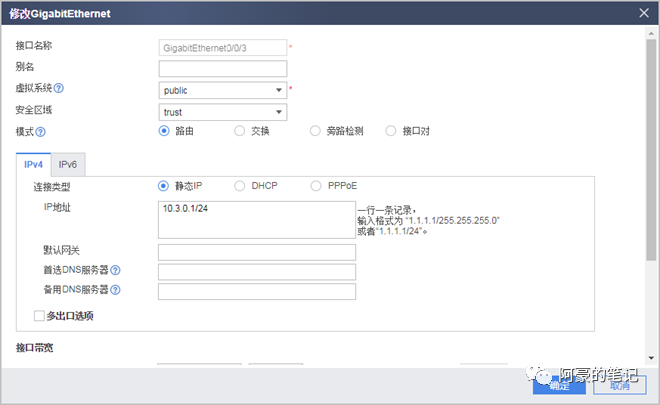 选择“网络> 接口”,单击待配置的接口所在行的,并做如下配置。