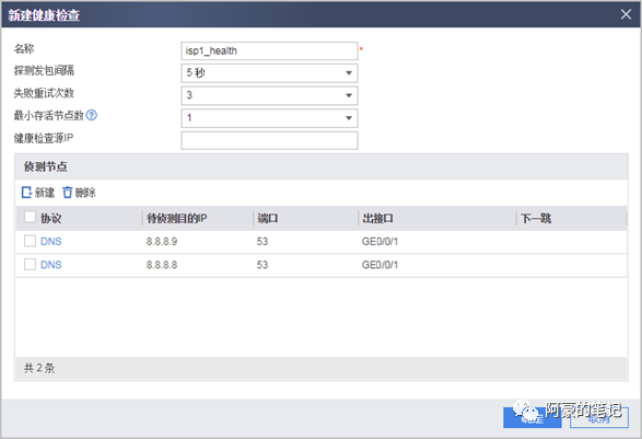 可选:配置健康检查功能,分别为ISP1和ISP2链路配置健康检查。