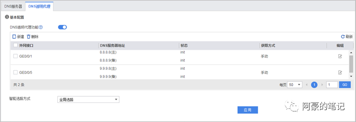 配置DNS透明代理功能。在出接口上绑定DNS服务器地址,配置DNS透明代理策略来指定做DNS透明代理的流量,并配置要排除的域名。