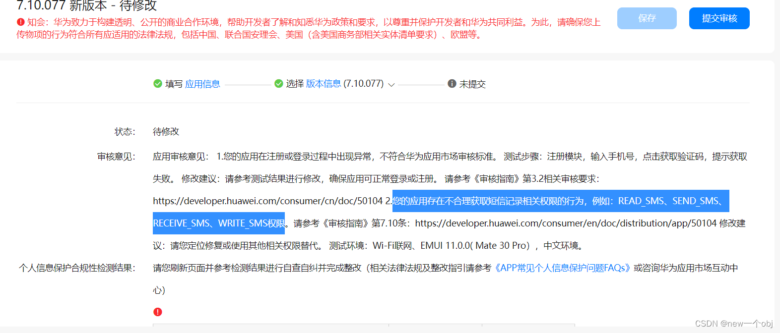 我果断的排查了manifest.json文件,删除了所有READ_SMS、SEND_SMS、RECEIVE_SMS、WRITE_SMS权限模块,也排查是否是原生插件导致,再次提交,等了两天结果又是同样的错误!!!