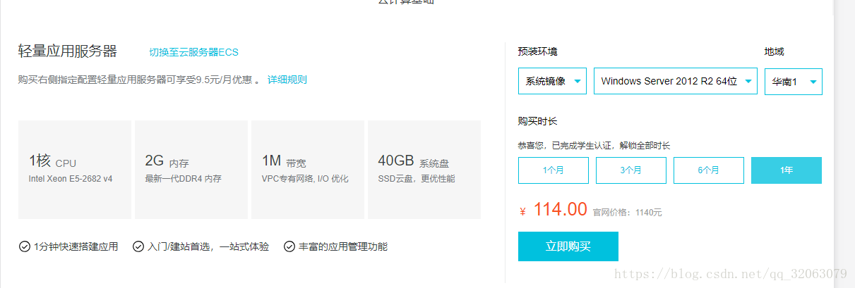 本人选择的是轻量级应用服务器,如果你喜欢也可以选择另一个,环境选择系统镜像--Windows Server 2012...--华南