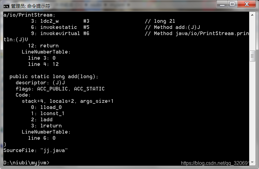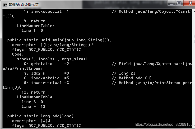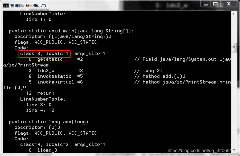 最后是lreturn,从当前方法返回long,在这个指令的实现中,会弹出当前帧,也就是add方法,那么下次执行的就是main方法了,并且会将当前帧的操作数栈,弹出长度为Long的Slot(因为是lreturn,同理还有ireturn、freturn等等),再将弹出的值压入将要执行的桢中的操作数栈中。这也就是方法返回。