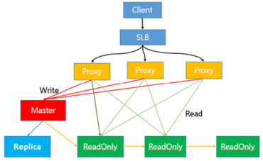 是一种解决热读问题的方案,针对于写少读多,通过在服务层下增加一层SLB层,进行负载均衡转发,转发到路由层Proxy,路由层Proxy负责将请求分为读请求、写请求,分发读请求到读服务器,如Mysql的从机器上,进行读取操作,将写请求分发到写服务器上,即Mysql的Master机器上,进行写操作。读机器可以横向扩充,进行读取性能的横向扩展。读写请求的分离是解决写少读多场景的优秀方案。在这种方法的基础上,可以将底层的数据中间件改变为Redis,通过Redis探测热点数据。当Redis发现热点数据后,可以通过在Proxy层增加本地缓存进行快速返回,横向增加Proxy方法可以扩展读能力,这种方式对Client端完全无感知,具体操作在Proxy层。