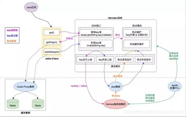 这是一种比较完善,性能高,解决大多数场景的方法。在进行缓存获取时,通过异步将 key 访问事件 异步(通过rsyslog将请求日志写入kafka消息队列中,hermes通过消费kafka消息进行请求数统计)上报给 Hermes 服务端集群 ,根据上报数据进行“热点探测,通过ETCD集群进行推送热点数据到服务端,通过apollo进行规则配置、黑白名单、集群地址信息配置。