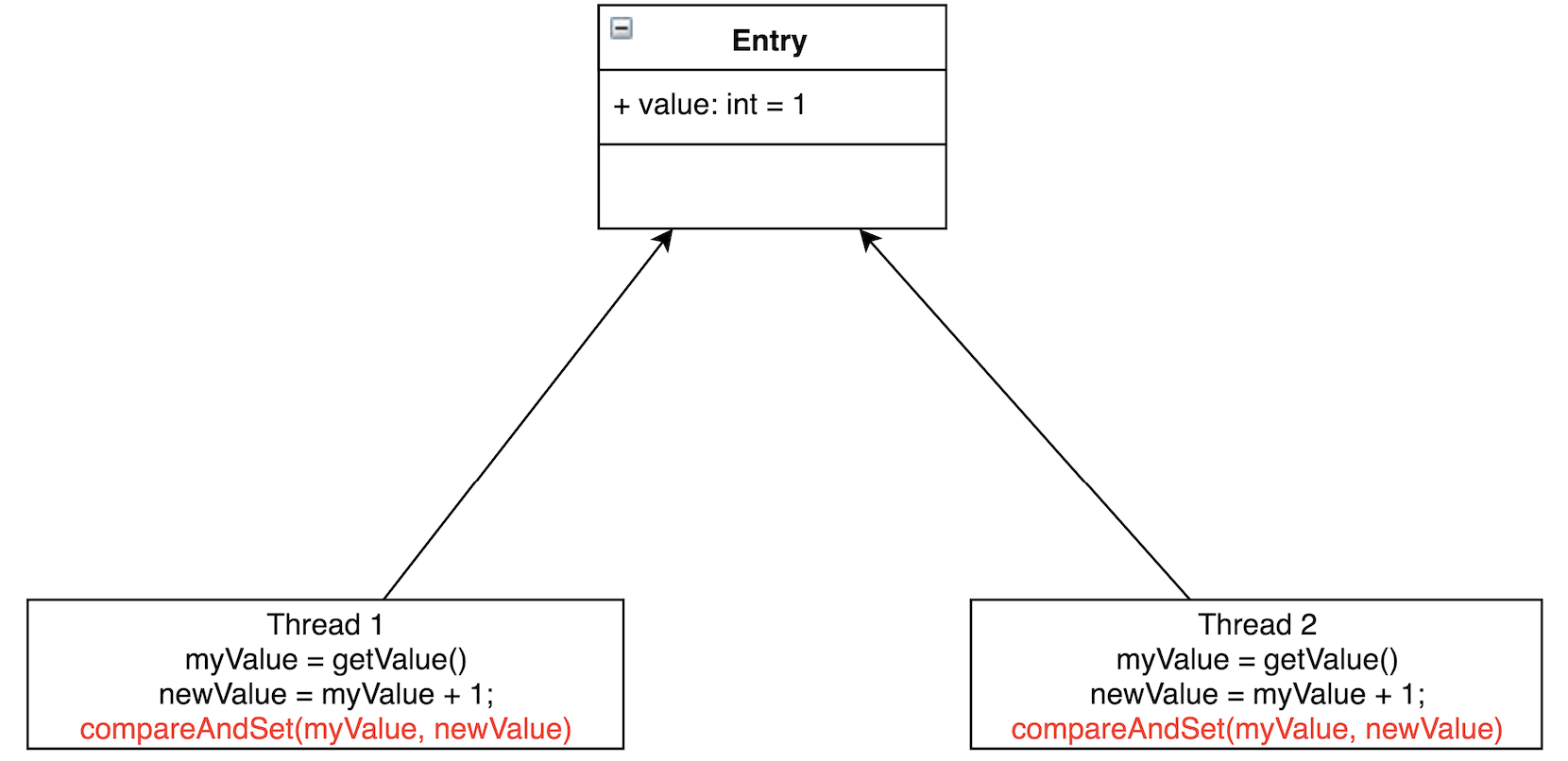 如图所示,Thread1和Thread2都要把Entry加1。若不加锁,也不使用CAS,有可能Thread1取到了myValue=1,Thread2也取到了myValue=1,然后相加,Entry中的value值为2。这与预期不相符,我们预期的是Entry的值经过两次相加后等于3。