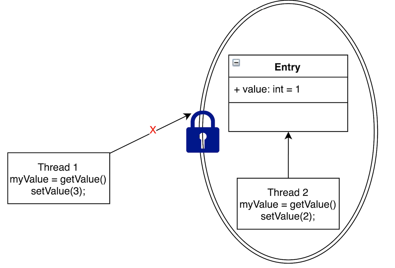 采取加锁的方式,默认线程会冲突,访问数据时,先加上锁再访问,访问之后再解锁。通过锁界定一个临界区,同时只有一个线程进入。如上图所示,Thread2访问Entry的时候,加了锁,Thread1就不能再执行访问Entry的代码,从而保证线程安全。