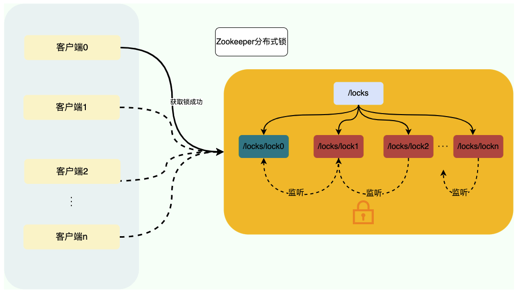 - 成功获取锁的客户端在出现故障之后,对应的子节点由于是临时顺序节点,也会被自动删除,避免了锁无法被释放。