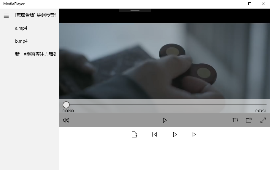 原本的"文本放置区"中的listBox想使用数据绑定绑定到输入的文件列表上,但是一直没弄弄懂怎么设置.媒体播放器的拖动条也没能实现,所以使用MediaElement自带的,没将下面的控件和其自带的控件放在一起.