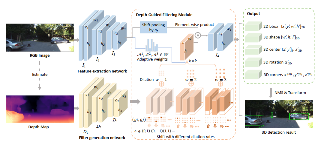 单目3D目标检测最大的挑战在于没法得到精确的深度信息,传统的二维卷积算法不适合这项任务,因为它不能捕获局部目标及其尺度信息,而这对三维目标检测至关重要。为了更好地表示三维结构,现有技术通常将二维图像估计的深度图转换为伪激光雷达表示,然后应用现有3D点云的物体检测算法。因此他们的结果在很大程度上取决于估计深度图的精度,从而导致性能不佳。在本文中,作者通过提出一种新的称为深度引导的局部卷积网络(LCN),更改了二维全卷积Dynamic-Depthwise-Dilated LCN ,其中的filter及其感受野可以从基于图像的深度图中自动学习,使不同图像的不同像素具有不同的filter。D4LCN克服了传统二维卷积的局限性,缩小了图像表示与三维点云表示的差距。D4LCN相对于最先进的KITTI的相对改进是9.1%,单目3D检测的SOTA方法。