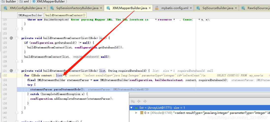 在XMLMapperBuilder中的buildStatementFromContext方法会解析mapper中的所有方法,本例只有一个,所以size为1