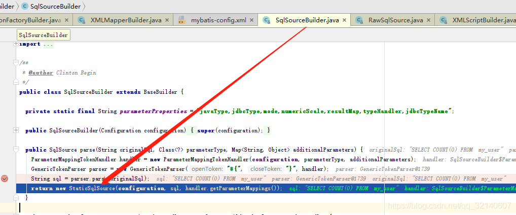 而解析SQL方法时就会涉及到SQL的拼接.在SqlSourceBuilder中会对SQL进行处理.这里也就是mybatis配置文件中会将#{value}替换到执行SQL的逻辑,这里顺便提一句,使用${value}的话,不会被替换,而是直接拼接SQL,这也是#与$在mybatis配置(mapper)中的区别
