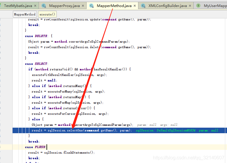 而这条SQL就是在SqlSessionFactory初始化时给Configuration对象赋值的.这样,执行的SQL就找到了,那么最终是如何执行的呢?
