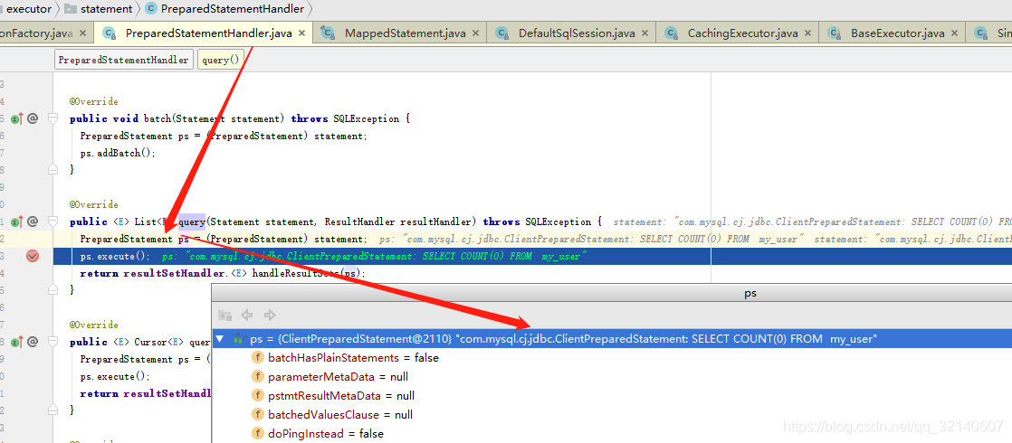 最后到了PreparedStatementHandler的query方法,可以看到,最后调用的是JDBC的方法,PreparedStatement的execute()方法