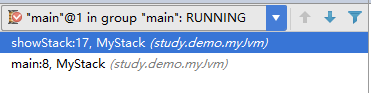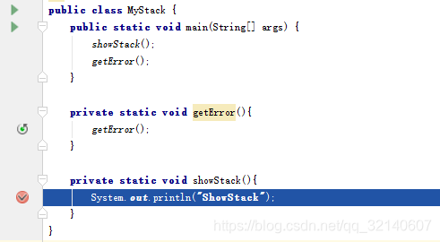 从图中可以看到,运行到该断点的时候,main没有执行完,被压在底部,showStack在顶部,这时在该执行线程的栈中就会分配两个栈帧分别对应这两个方法.而当运行到getError方法时则会抛出异常 java.lang.StackOverflowError.原因在于getError方法是一个无限递归,不停调用自己,这样也就意味着需要不停的创建栈帧,而当线程对应的栈的空间不足以容纳这么多栈帧时,就会抛出该Erorr.