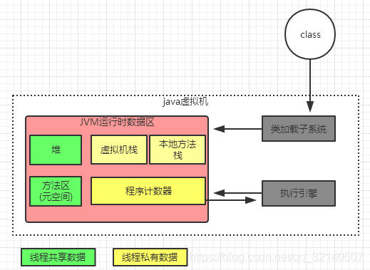 这是一张Class的加载图,虚拟机栈,本地方法栈,程序计数器为线程私有数据,一个线程对应一个.堆,方法区(元空间)为线程共享数据,所以线程都能访问.接下来对这些部分依次分析.