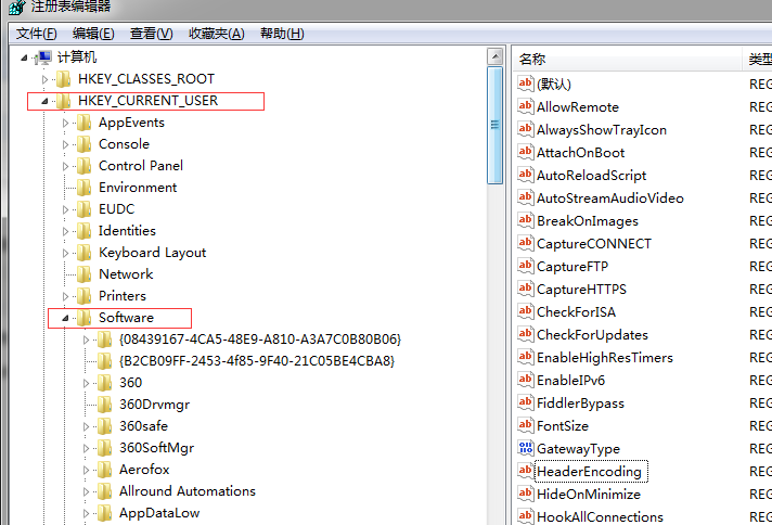 cmd窗口执行regedit命令,在弹出的注册表编辑界面找到fiddler