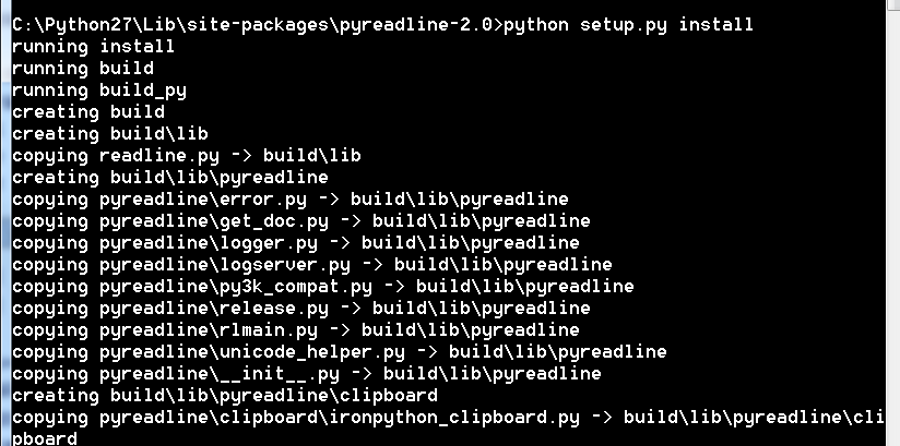 4.安装pyreadline,进入第三部解压后的目录,执行python setup.py install,等待安装完毕
