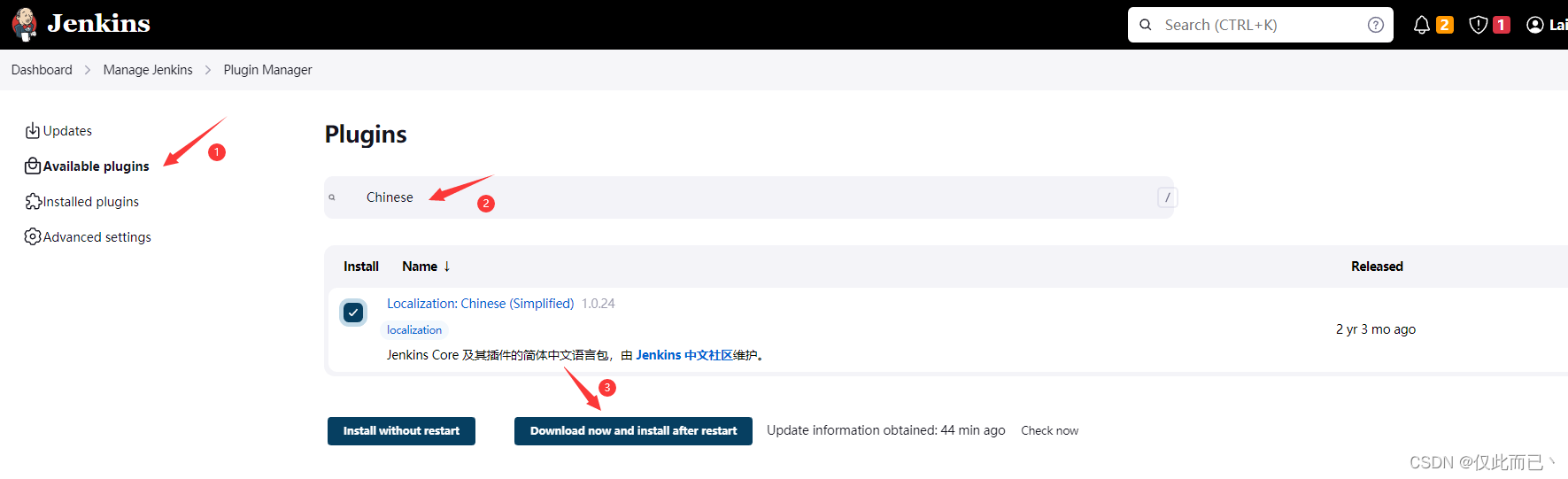 2、点击“Available plugins”,搜索“Chinese”,然后点击“立即下载,安装后重启”。