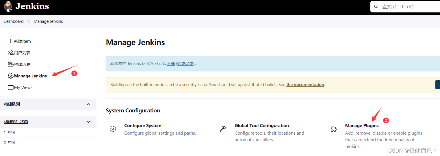 1、登录进Jenkins,点击“Manage Jenkins”菜单,选择“Manage Plugins”。