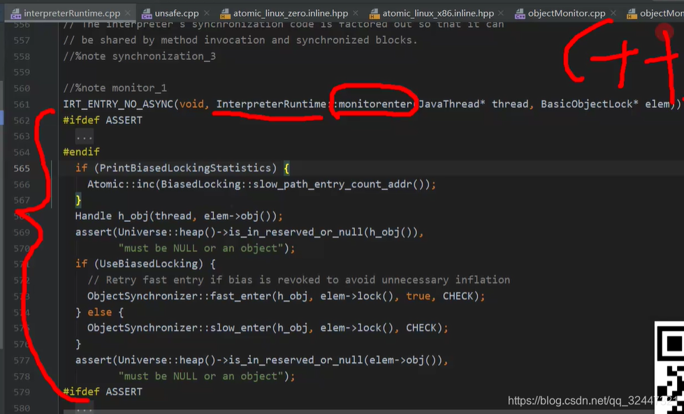 synchronized 对应的C++代码(当线程读取到关键字synchronized时,进行锁升级的判断)