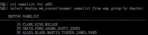 SQL> select deptno,wm_concat(ename) namelist from emp group by deptno; |