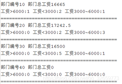 --打印工资区间人数 DBMS_OUTPUT.PUT_LINE ('工资>6000:'||count1||' 工资<3000:'||count2||' 工资3000~6000:'||count3); DBMS_OUTPUT.PUT_LINE ('========================================='); --结束循环 end loop; --关闭光标 close cdept; end; |