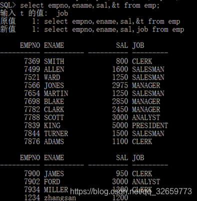 SQL> select empno,ename,sal,&t from emp;