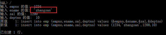 set serveroutput on insert into emp (empno,ename,sal,deptno) values(1122,'zhangsan',1920,10); |