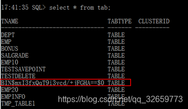 清空回收站 SQL> purge recyclebin; 删除的表,可以从回收站查询 SQL> drop table TESTSAVEPOINT; SQL> select * from "BIN$ULtYrrqvTlqfr+qeSXIHNA==$0"; 闪回删除 SQL> flashback table TESTSAVEPOINT to before drop; 注意:管理员没有回收站sys |