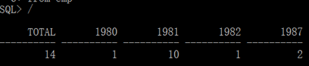DBMS_OUTPUT.PUT_LINE('Total'||(count80 + count81 + count82 + count87)); DBMS_OUTPUT.PUT_LINE('1980'||count80); DBMS_OUTPUT.PUT_LINE('1981'||count81); DBMS_OUTPUT.PUT_LINE('1982'||count82); DBMS_OUTPUT.PUT_LINE('1987'||count87); end; |
