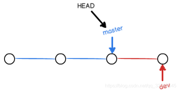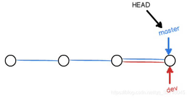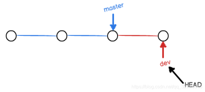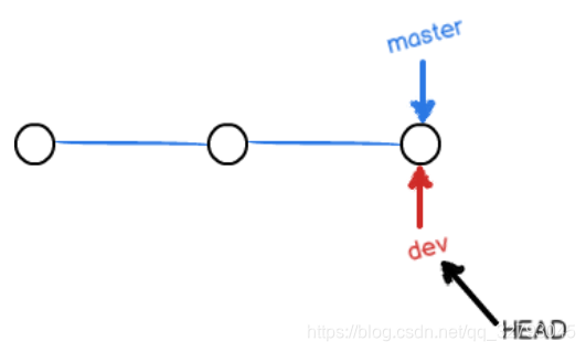 当创建新分支,如dev,就创建了一个dev的指针,指向master的相同提交。再把HEAD指向dev,就表示当前分支在dev上。