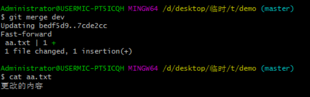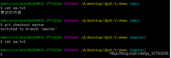 回到master分支后可以发现aa.txt文件的内容没有更改。