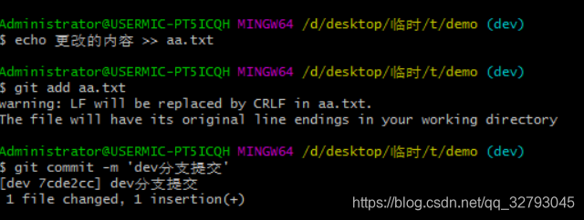 当指针移动到dev,那么现在的提交和修改就在dev分支上了。每次提交dev的分支线就延长,而master则不会。
