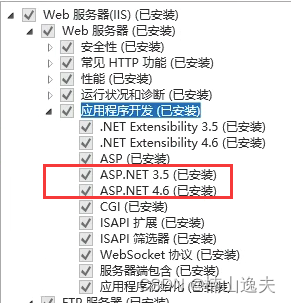 3.5、这里就到了关键地方,勾选“Web服务器(IIS)”之后,系统默认全选,实际上有一部分是没有选中的,最重要的是“应用程序开发”中的“ASP.NET 3.5”和“ASP.NET 4.6”这两个必须手动勾选(勾选之前注意第一点提前安装.net 3.5用的插件 NetFx3.cab)